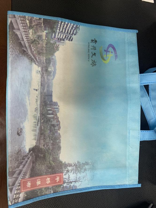 塑料袋由贡井区图书馆所开发的可以多次循环使用的垃圾袋,其正后两面均印刷有平桥瀑布美景,它不仅节约环保,而且美观大方。